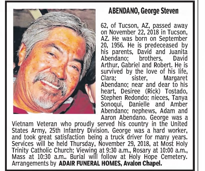 Abendano, George Steven 62, of Tucson, AZ, passed away on November 22,